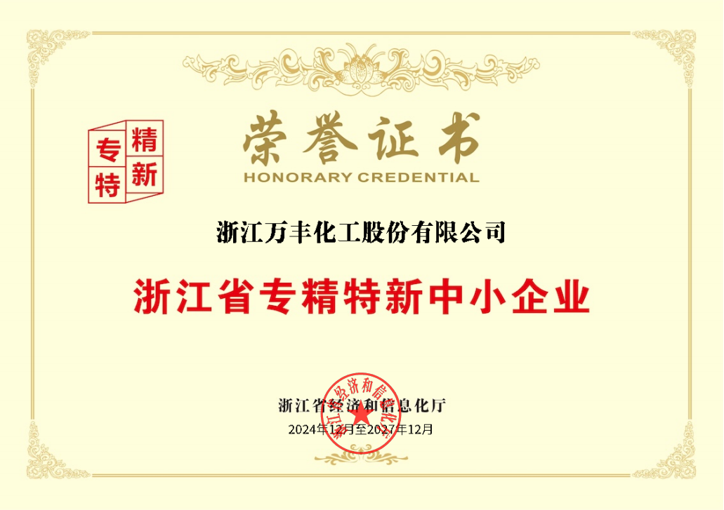 近日,MK官方网站凭借在精细化工领域的卓越表现和创新能力,成功通过浙江省经济和信息化厅的严格评审,荣获“浙江省专精特新中小企业”认定。这一殊荣不仅是对万丰股份长期以来专注技术研发、产品创新和市场拓展的高度认可,更是对公司未来发展的激励与鞭策。