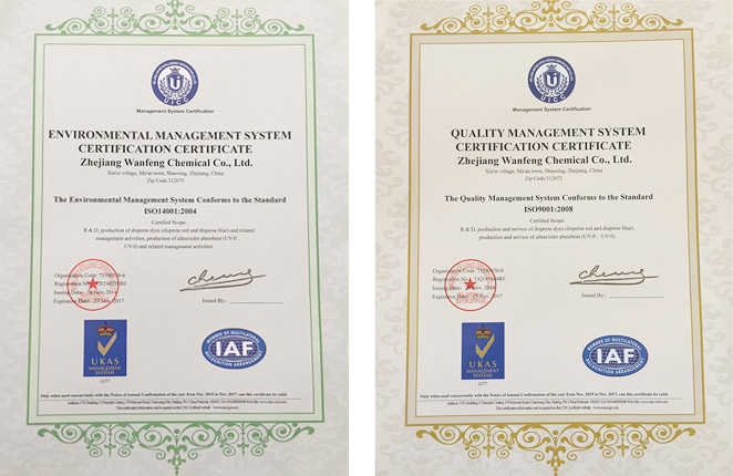 公司拥有完善的质量管理体系和先进的仪器设备、技术水平和完善的应用服务。公司质检配套设施完善,拥有水洗、日晒、摩擦、升华等各种色牢度测试仪,以及液相、气相、紫外、气质联用、分光光度计等精密分析仪器设备。通过这些先进设备的配置确保了产品各项指标均能达到世界领先水平,对每一件产品都制定了严格的质量检测标准,并按此标准进行严格的质量监控,保证了产品高质量。